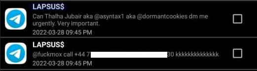 The leader of LAPSUS$ responded by gleefully posting Asyntax’s real name, phone number, and other hacker handles into a public chat room on Telegram: