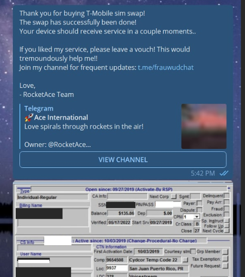 Beginning in 2022, EarthtoStar co-ran a bustling Telegram channel called Star Chat, which was home to a prolific SIM-swapping group that relentlessly used voice- and SMS-based phishing attacks to steal credentials from employees at the major wireless providers in the U.S. and U.K.
