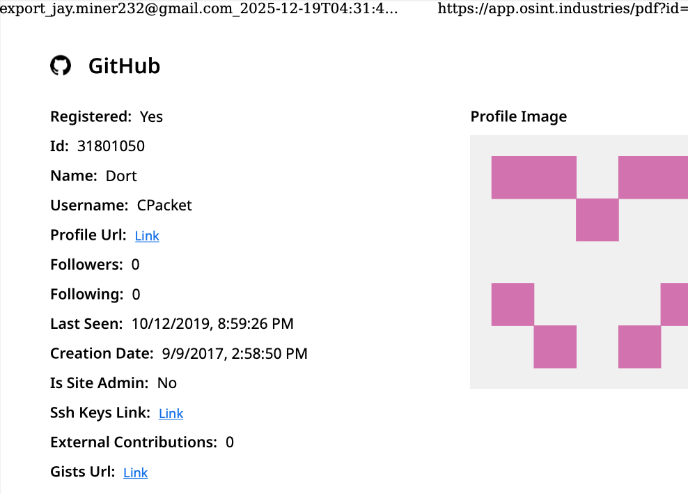 A public “dox” created in 2020 asserted Dort was a teenager from Canada (DOB August 2003) who used the aliases “CPacket” and “M1ce.” A search on the username CPacket at the open source intelligence platform OSINT Industries finds a GitHub account under the names Dort and CPacket that was created in 2017 using the email address jay.miner232@gmail.com.